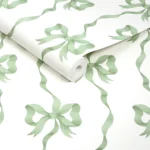 Ribbon Bow Blue wallpaper brings picture-perfect charm, as soft satin sky blue bows drift like daydreams across a crisp white backdrop. Painted in delicate watercolour brushstrokes, each trailing ribbon loops and curls with a lightness that feels almost airborne. This design is simple yet full of joy, feeling both pretty and playful.